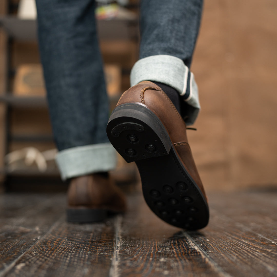 Our studded sole offers maximum grip, providing stability whether you're striding through city streets or rugged paths. The matching color welt seamlessly blends with the outsole, showcasing a refined yet understated style.