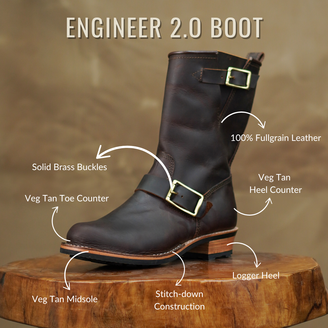 Featuring a logger heel, veg-tan midsole, and a secure gusseted tongue, the Engineer 2.0 is built for maximum functionality and comfort. Its meticulous handstitching and handlasting ensure exceptional durability and a flawless finish. Whether you're riding, working, or exploring, the Engineer 2.0 is your dependable partner for every adventure.