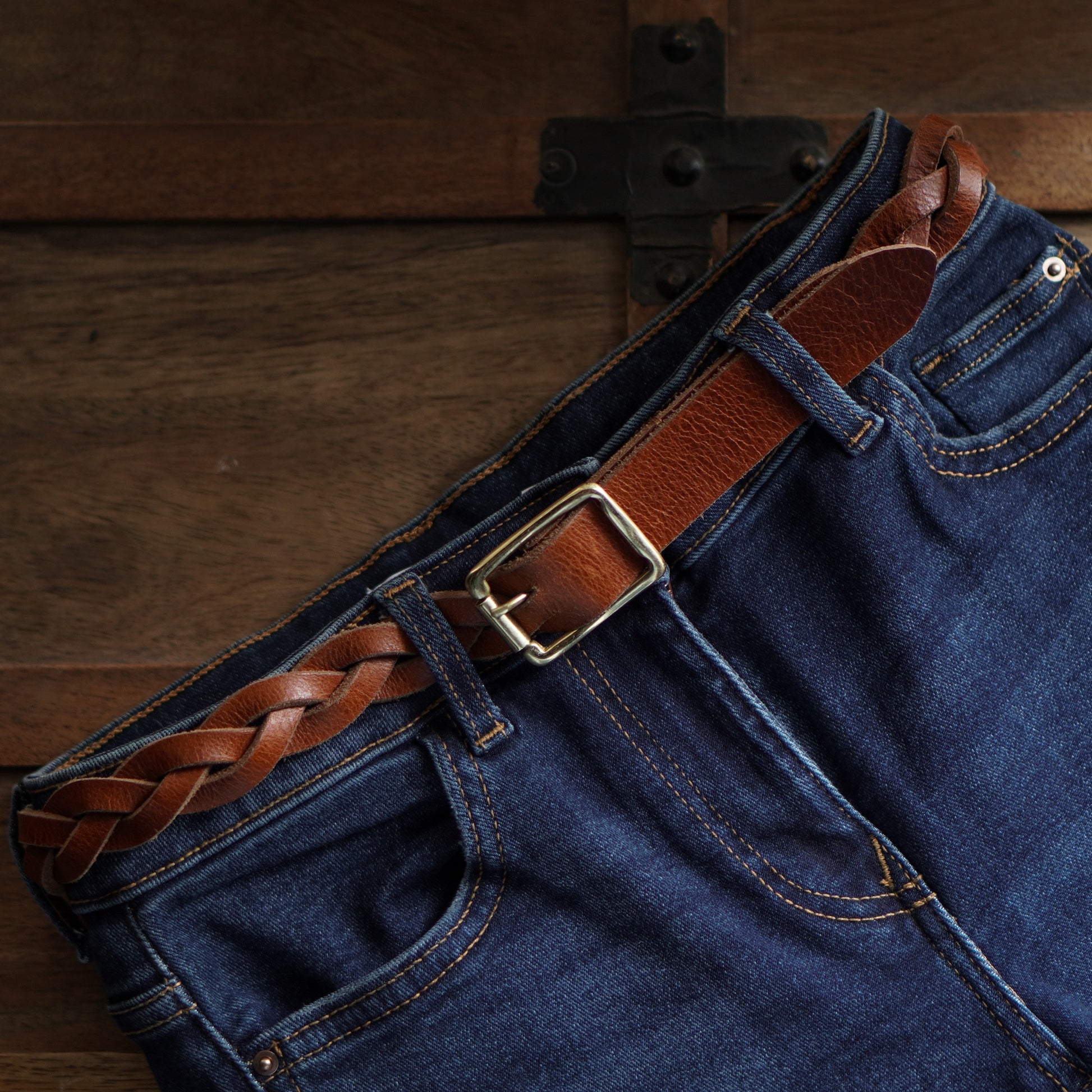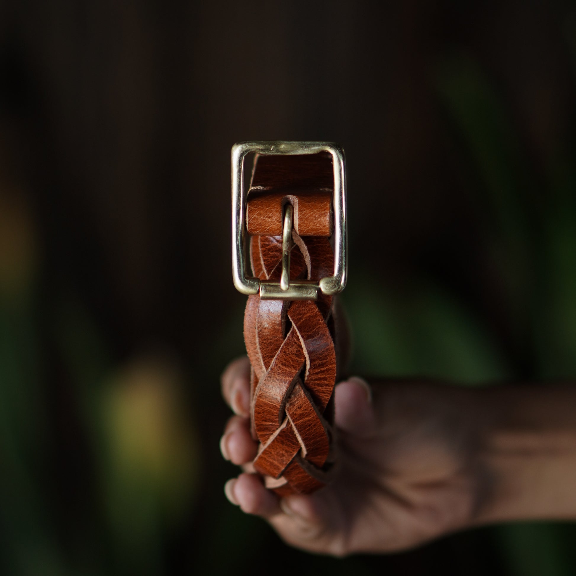 Dieser elegante geflochtene Ledergürtel ist ein handgefertigter Gürtel aus Vollnarbenleder mit einer rustikalen Messingschnalle für einen Vintage-Effekt und einem gewebten Schlaufendesign ohne Löcher, passend für alle Größen.