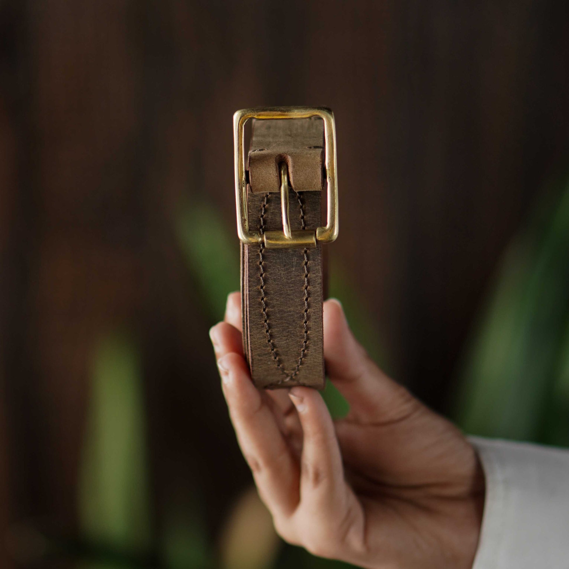 Classy minimal embroidered sleek belt, featuring handcrafted Full-grain leather, Nickle-free Brass hardware, Minimal debossed logo at the back, buckle fastening, punched holes, and adjustable fit.