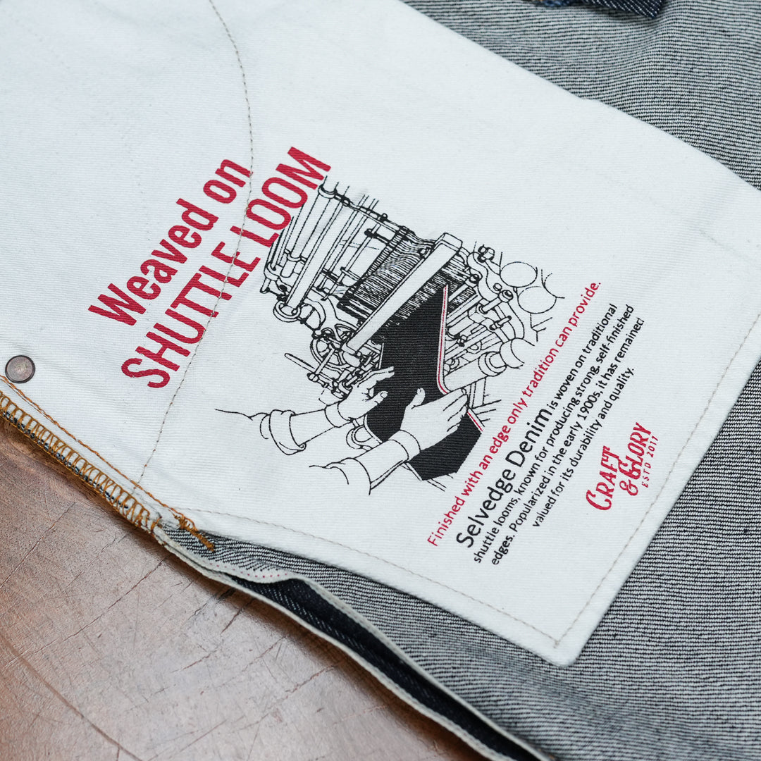 Fabric: 100% cotton, 13 oz indigo selvedge denim.