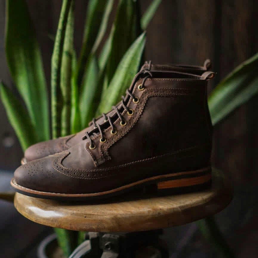 These Heritage Style Goodyear welted Dress Boots with Classic brogue panel stitching, hand stitched rubber outsoles, perfect for a rugged loving gentleman.