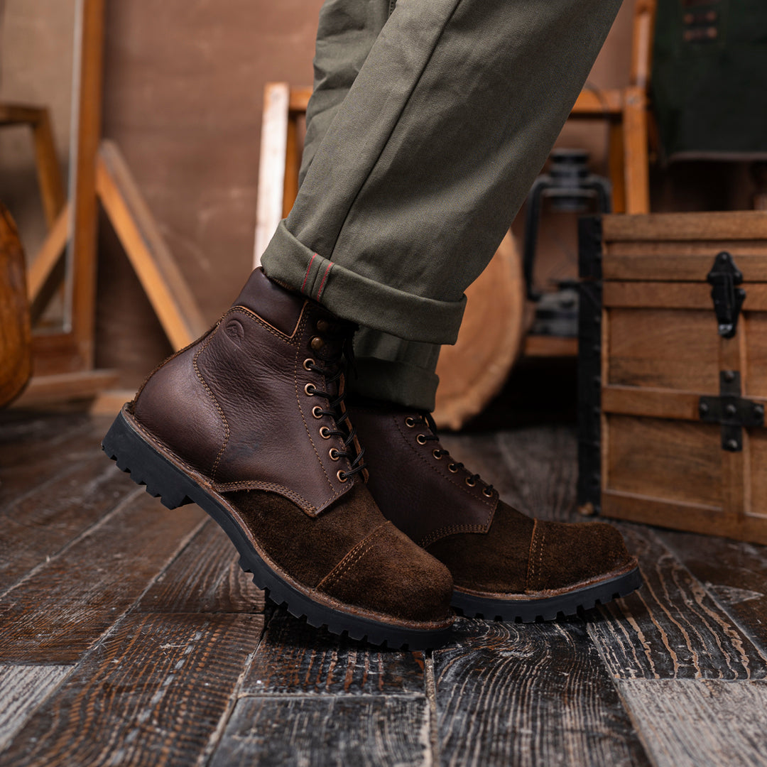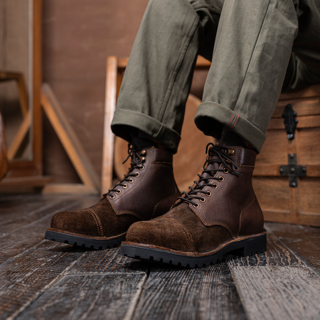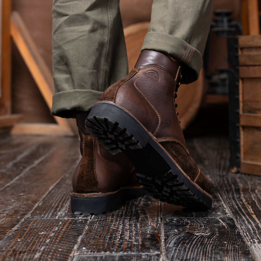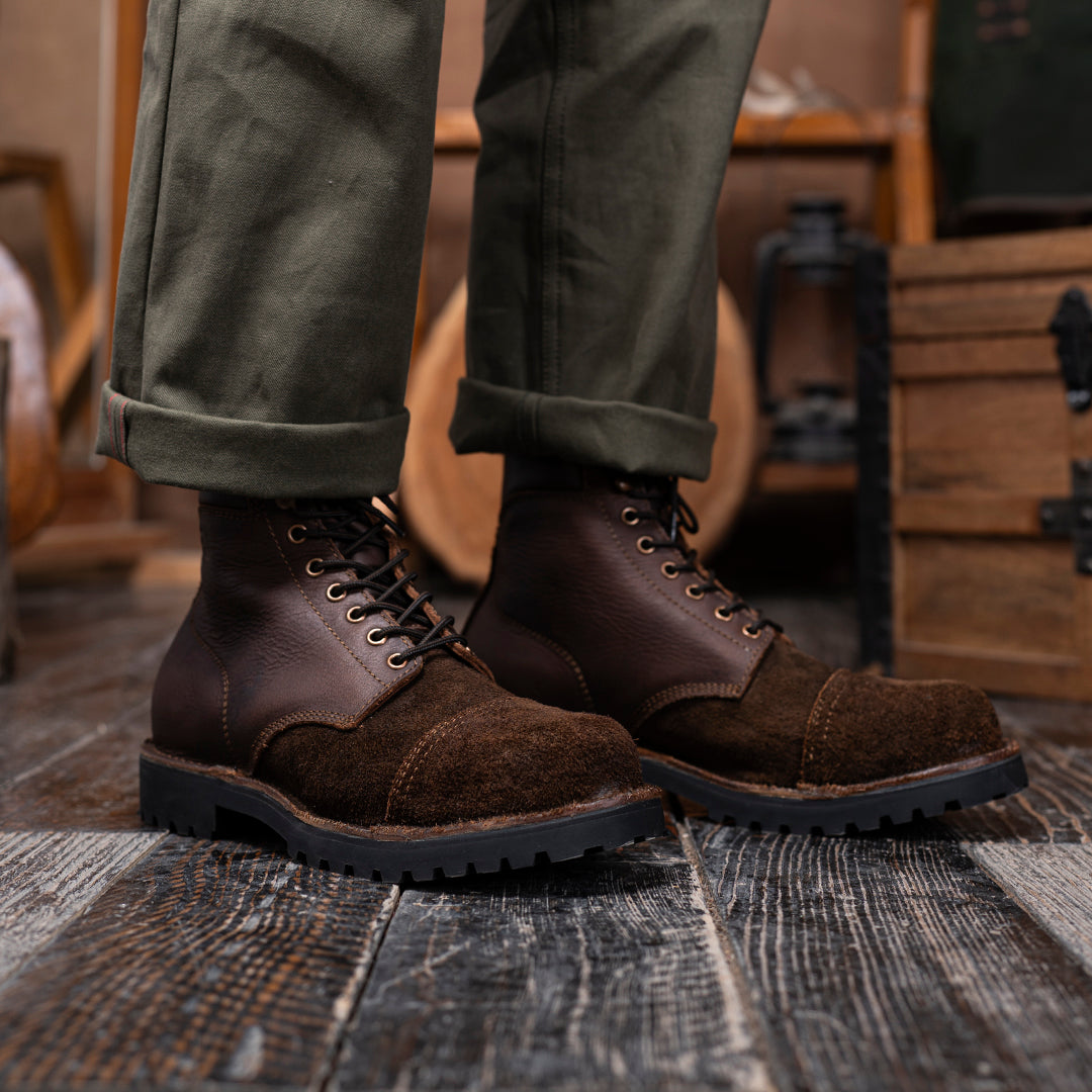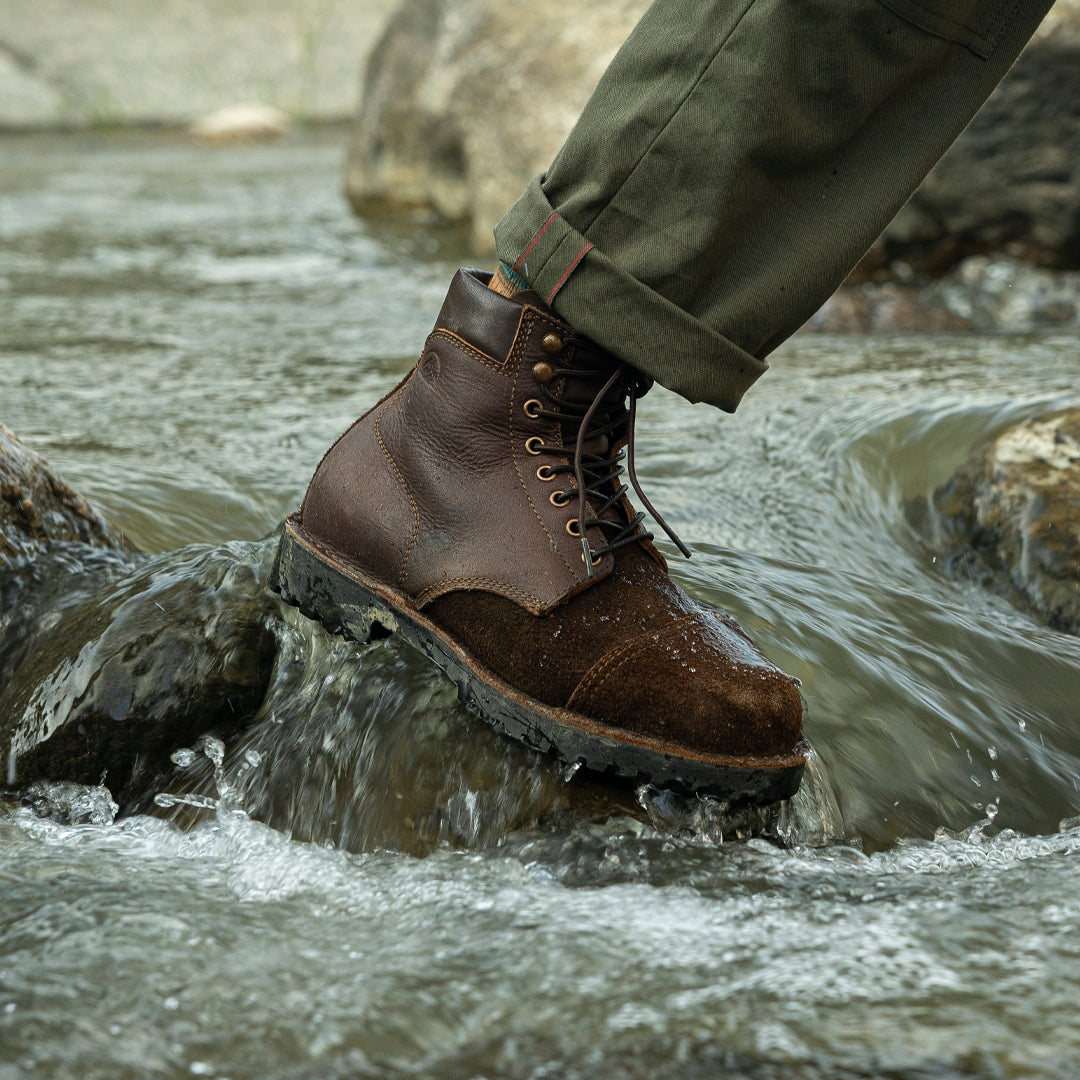 Equal parts tough and timeworn, the Grizzly Brown Trailmaster speaks the language of trail and tradition. Built with both rough-out and grain panels of Stormshield44 full-grain buffalo leather, this cap-toe boot takes on the outdoors with comfort and edge.