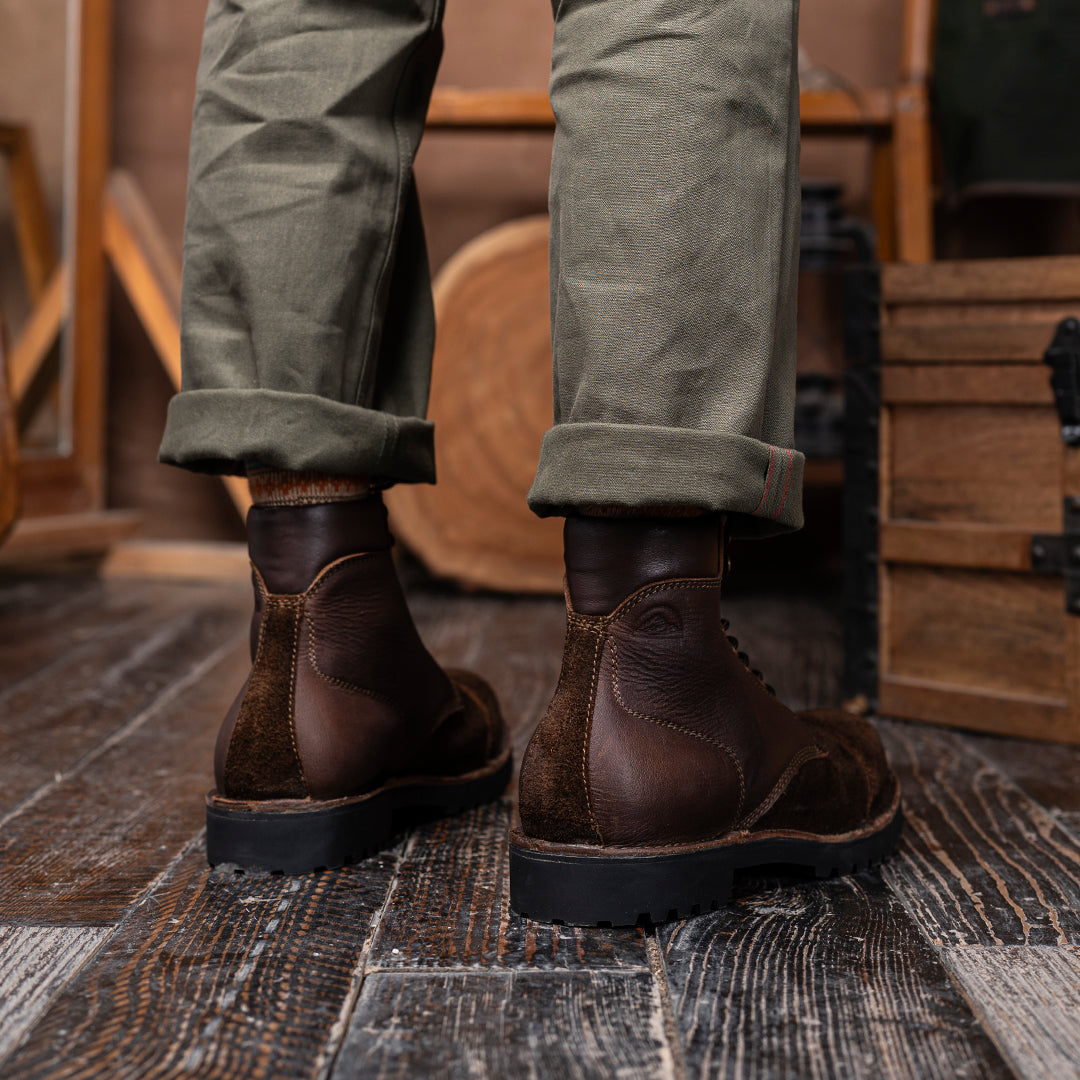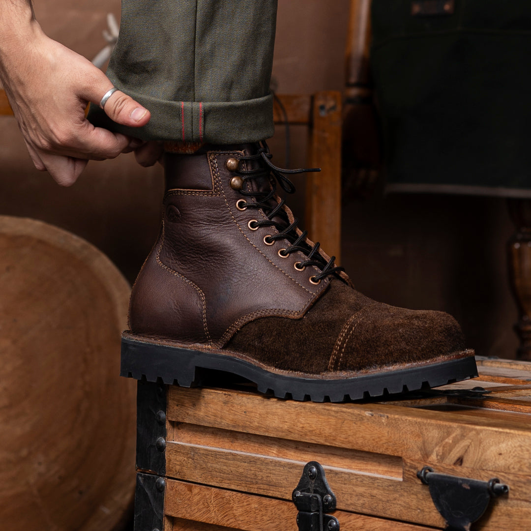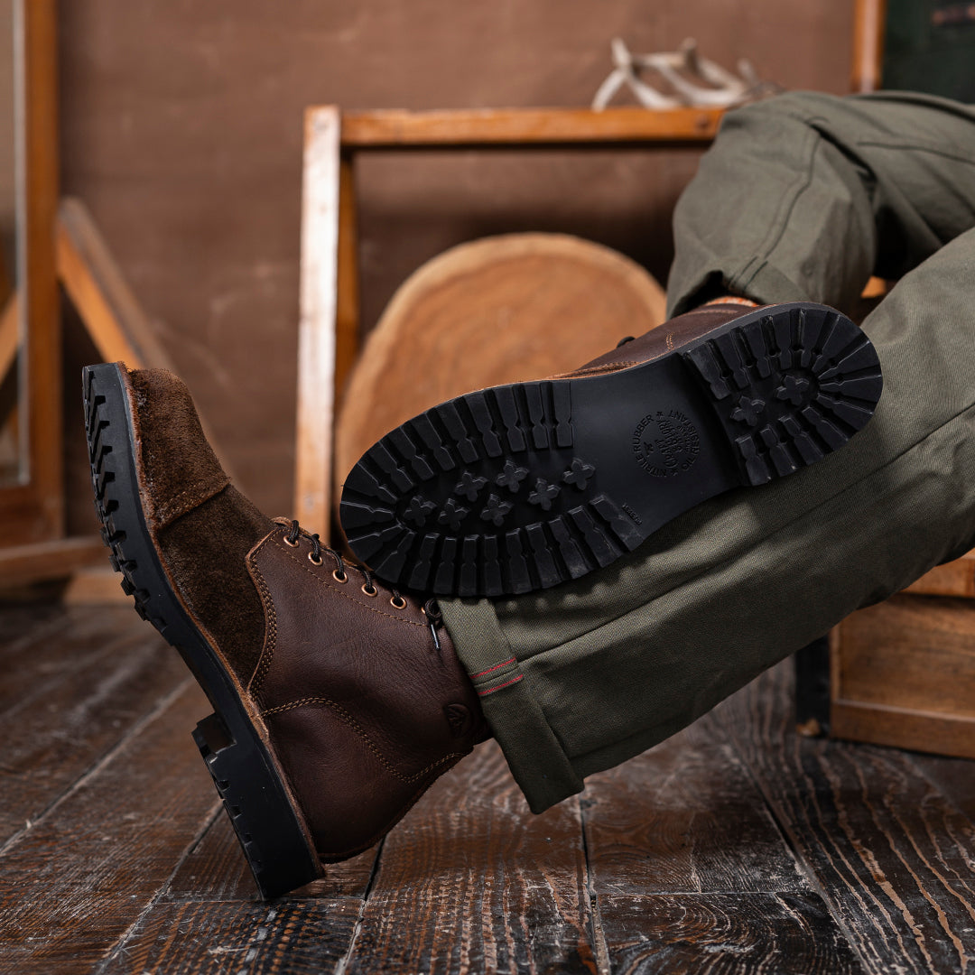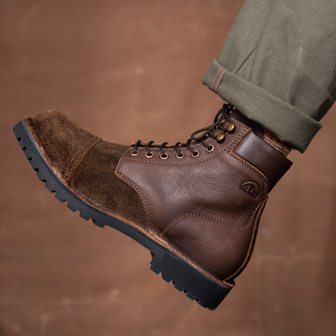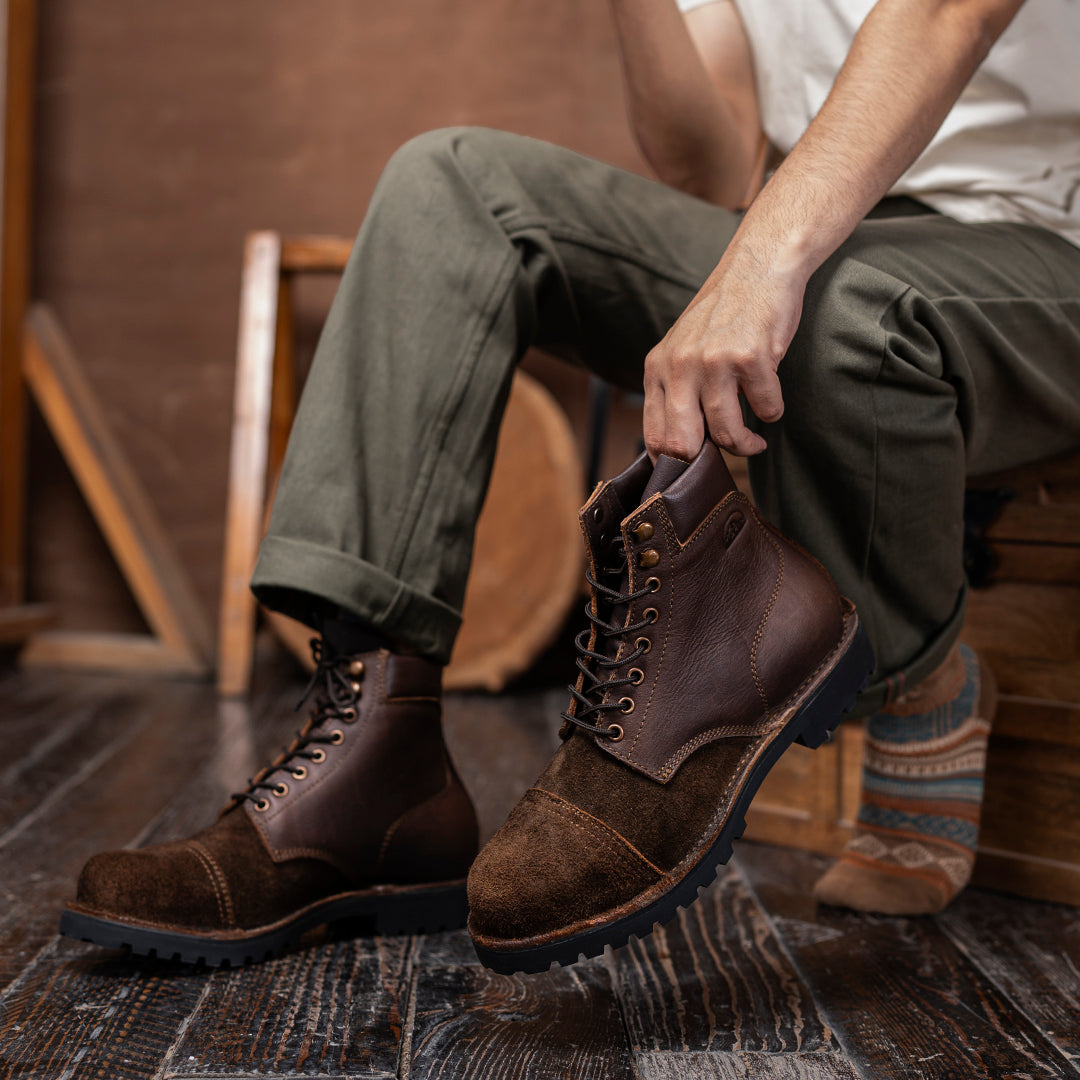 Equal parts tough and timeworn, the Grizzly Brown Trailmaster speaks the language of trail and tradition. Built with both rough-out and grain panels of Stormshield44 full-grain buffalo leather, this cap-toe boot takes on the outdoors with comfort and edge.