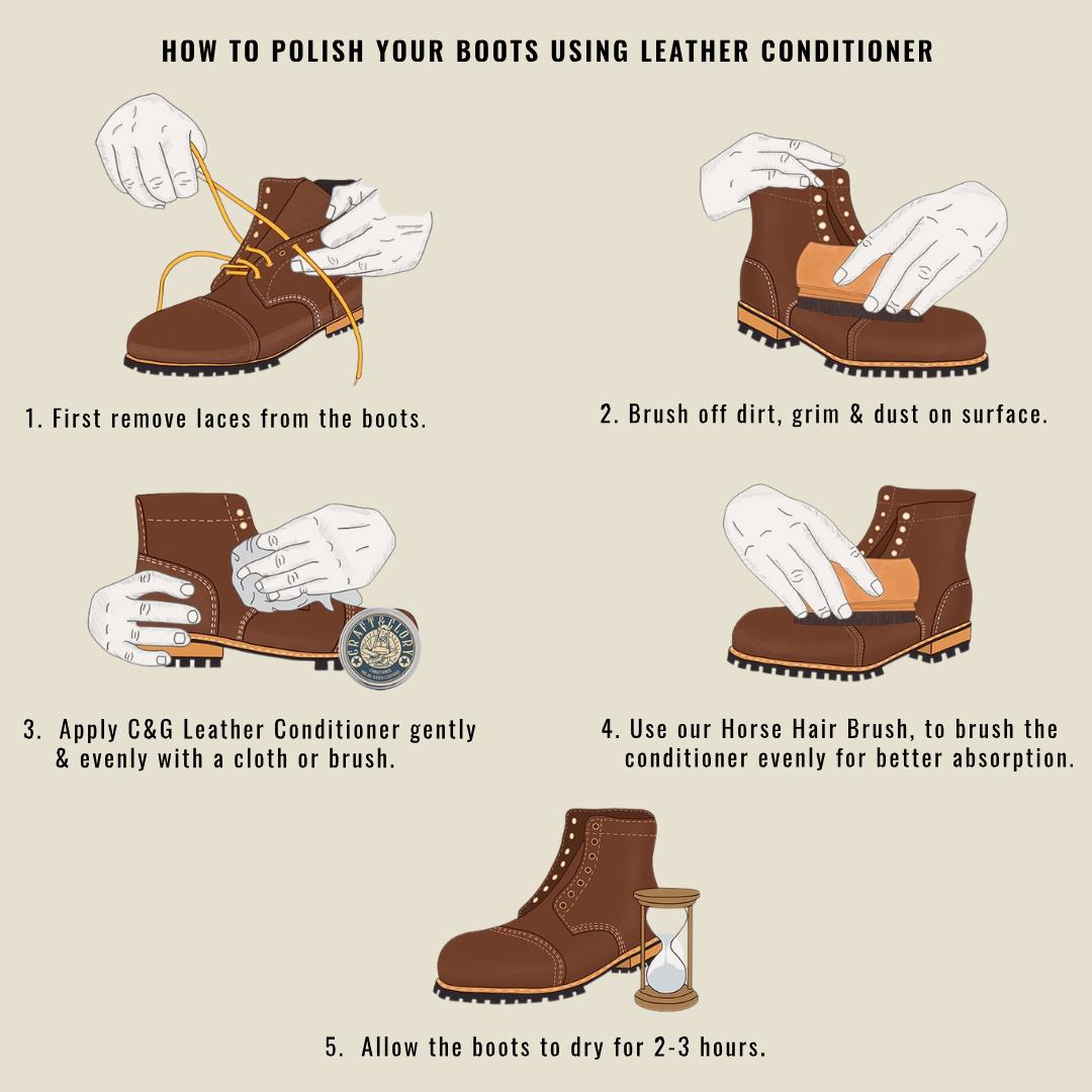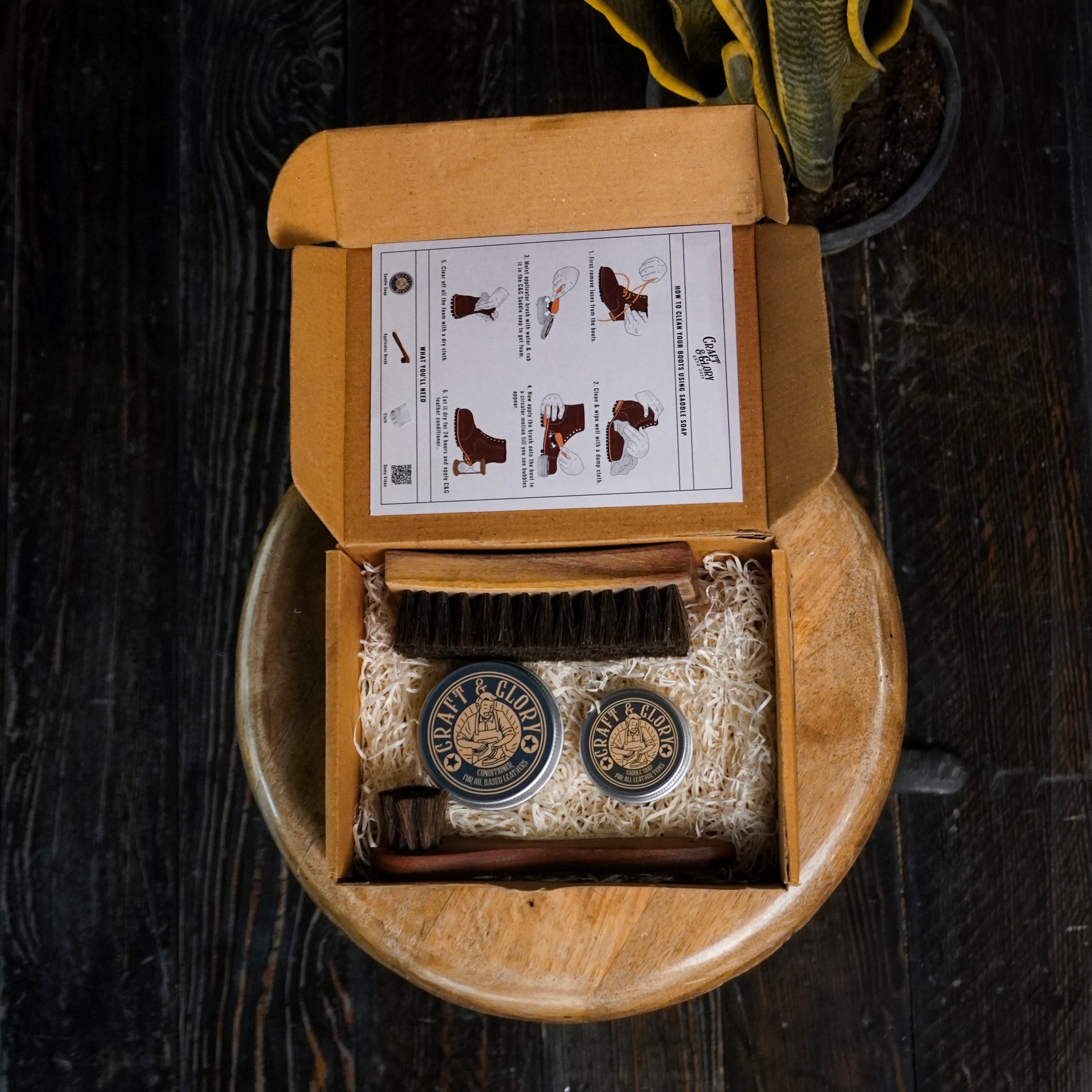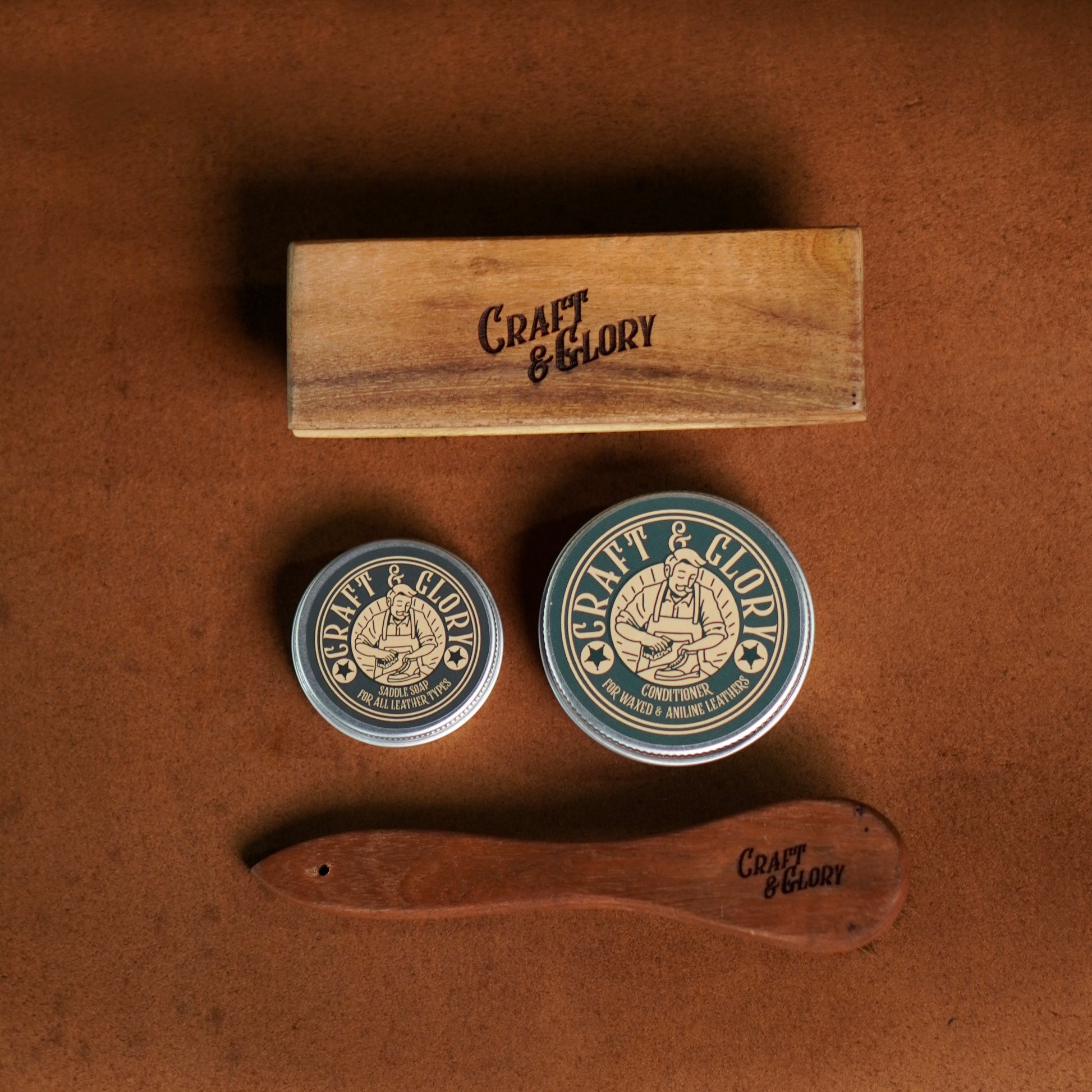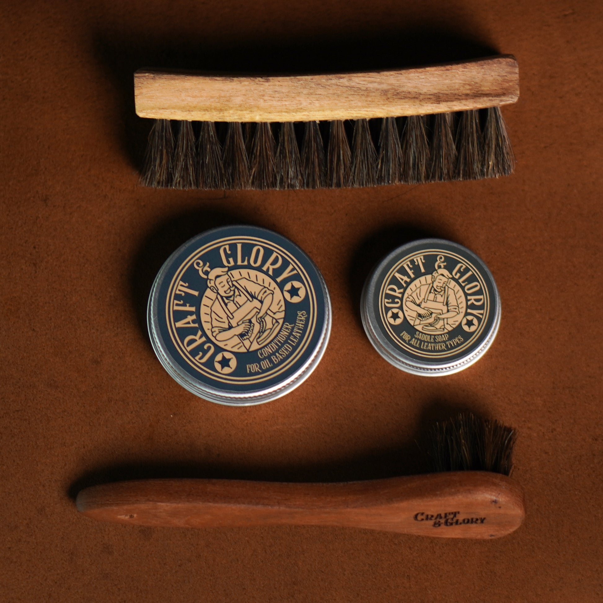 The Complete Care Kit features Saddle soap, an Applicator brush, Leather Conditioner & Horsehair brush. Suitable for leather boots, purses, wallets, belts, sneakers, jackets, etc. making it an essential leather care kit for various items. This kit ensures that your leather goods remain clean, protected, and in excellent condition for years to come.