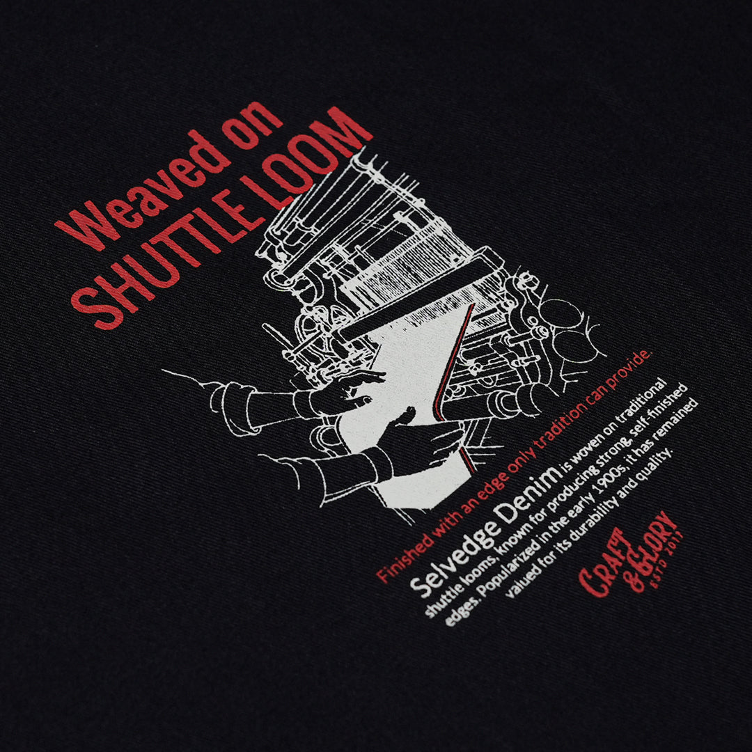 Fabric: 100% cotton, Mid-weight 14 oz black warp and black weft selvedge denim.