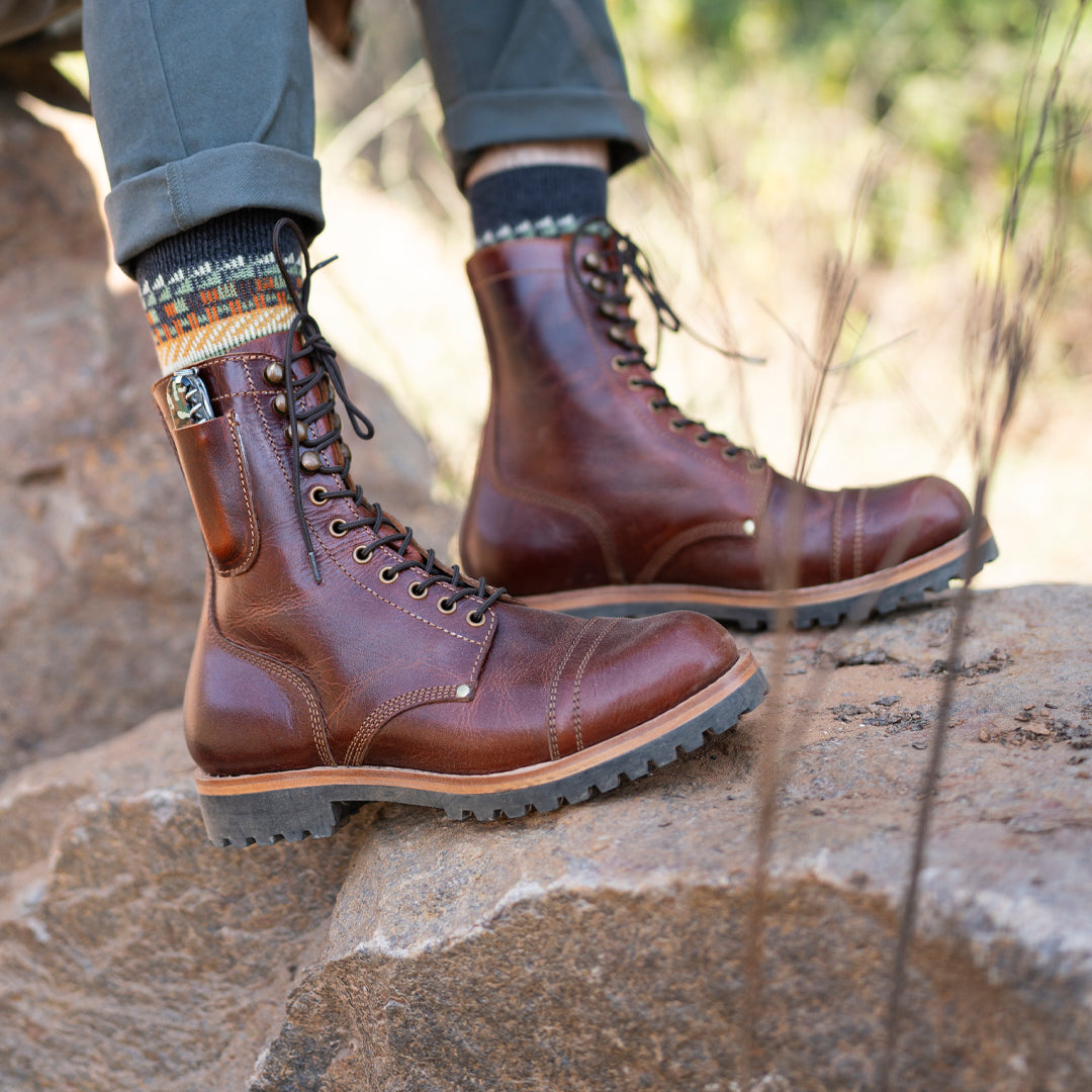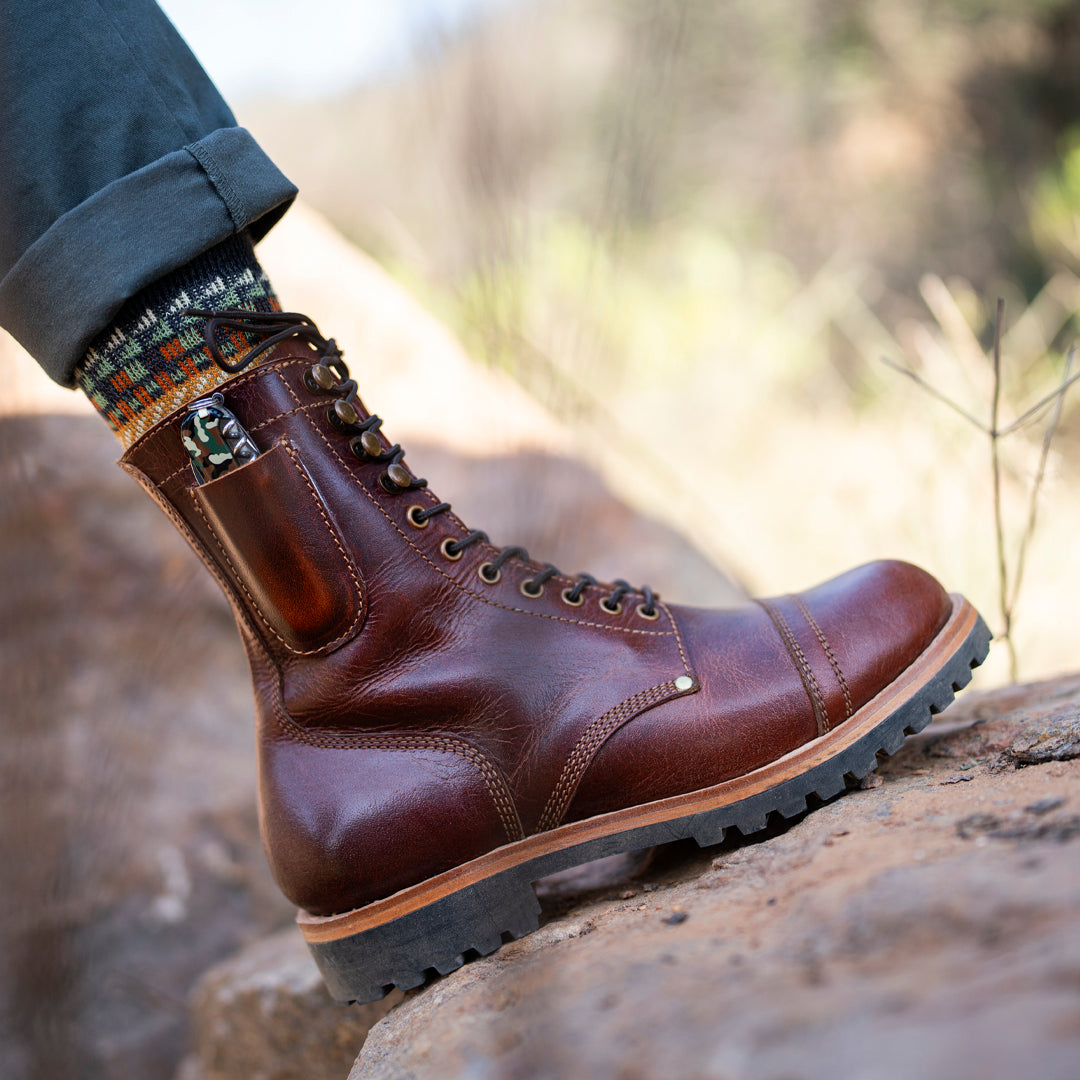 Key features include a veg-tan midsole for enhanced durability, and a gusseted tongue for water and dust protection, and a knife pocket. Every pair takes over 15 hours to craft—embodying true craftsmanship.