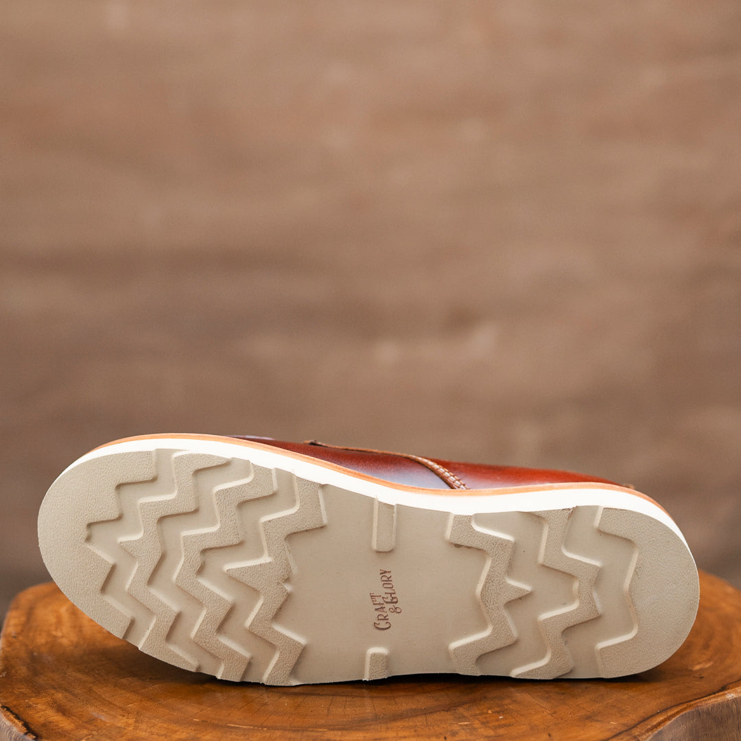 Highest quality natural rubber sole with deep lugs for ultimate traction and abrasion. Stacked leather heels. Sole is handstiched to the welt. Great for outdoors and all day wearing.