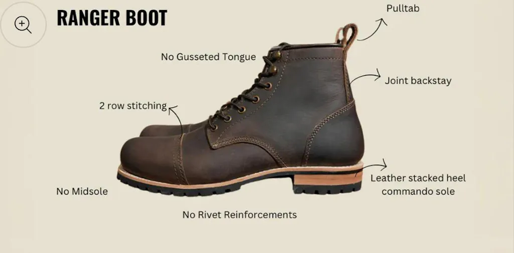 Toe box and heel counters are crafted out of thick vegetable tanned leather and dipped in industrial hardeners to keep your boot structured and durable for a lifetime.