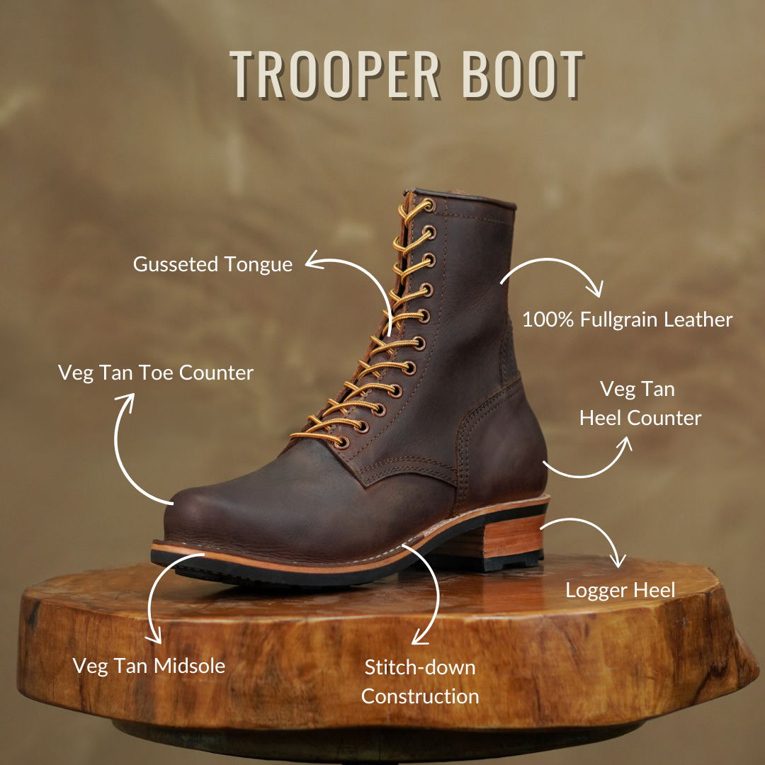 Made using stitch-down construction, the Trooper boot ensures exceptional durability and comfort. Made from 100% full-grain buffalo leather, the Trooper features a sturdy 8-inch shaft, offering unmatched support and protection.