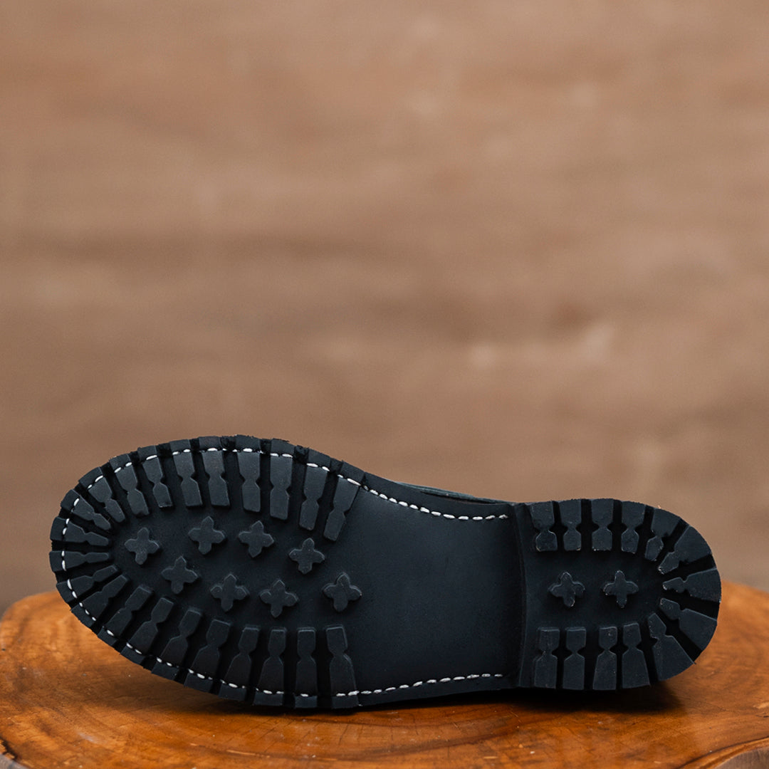 · Full rubber commando sole with stacked leather heels.