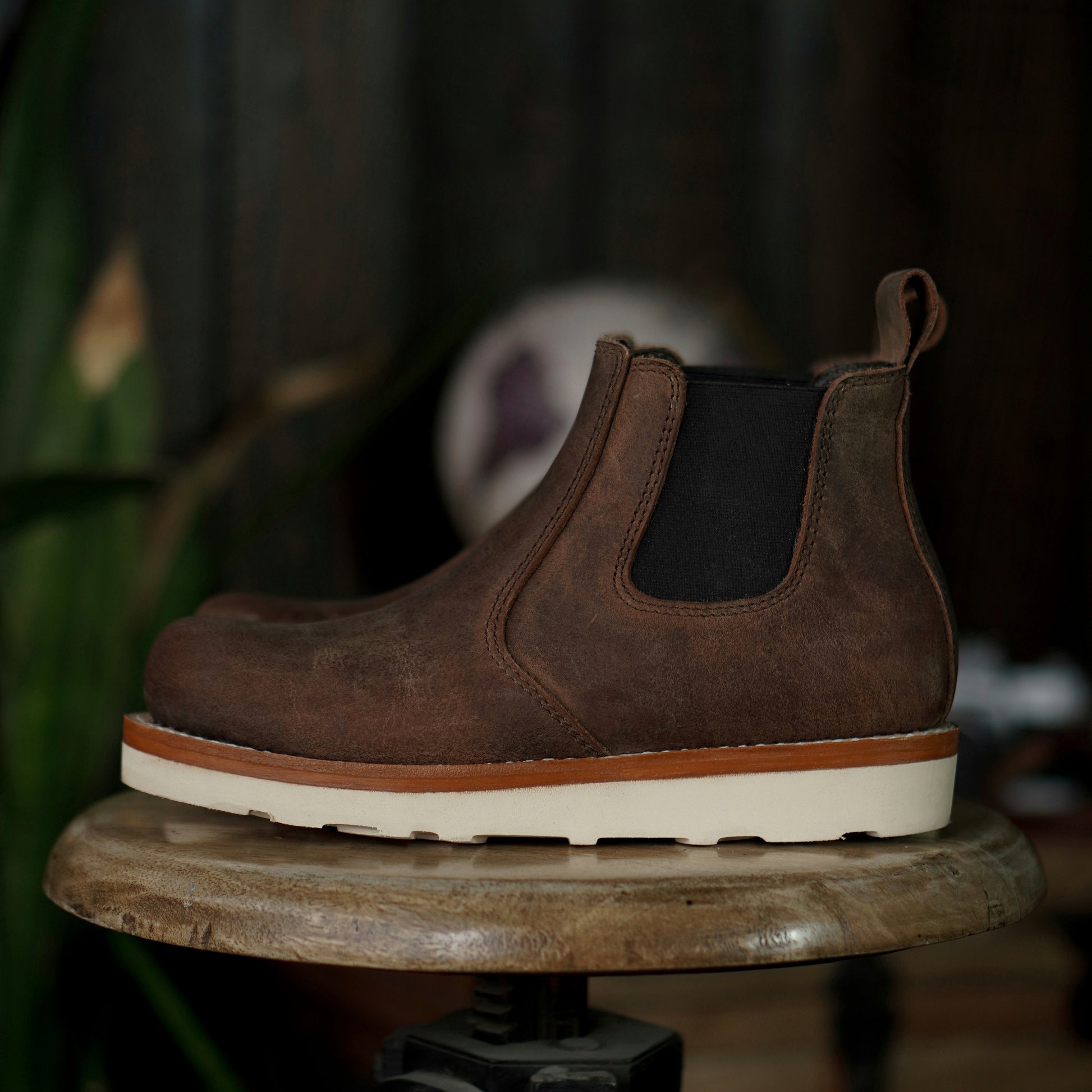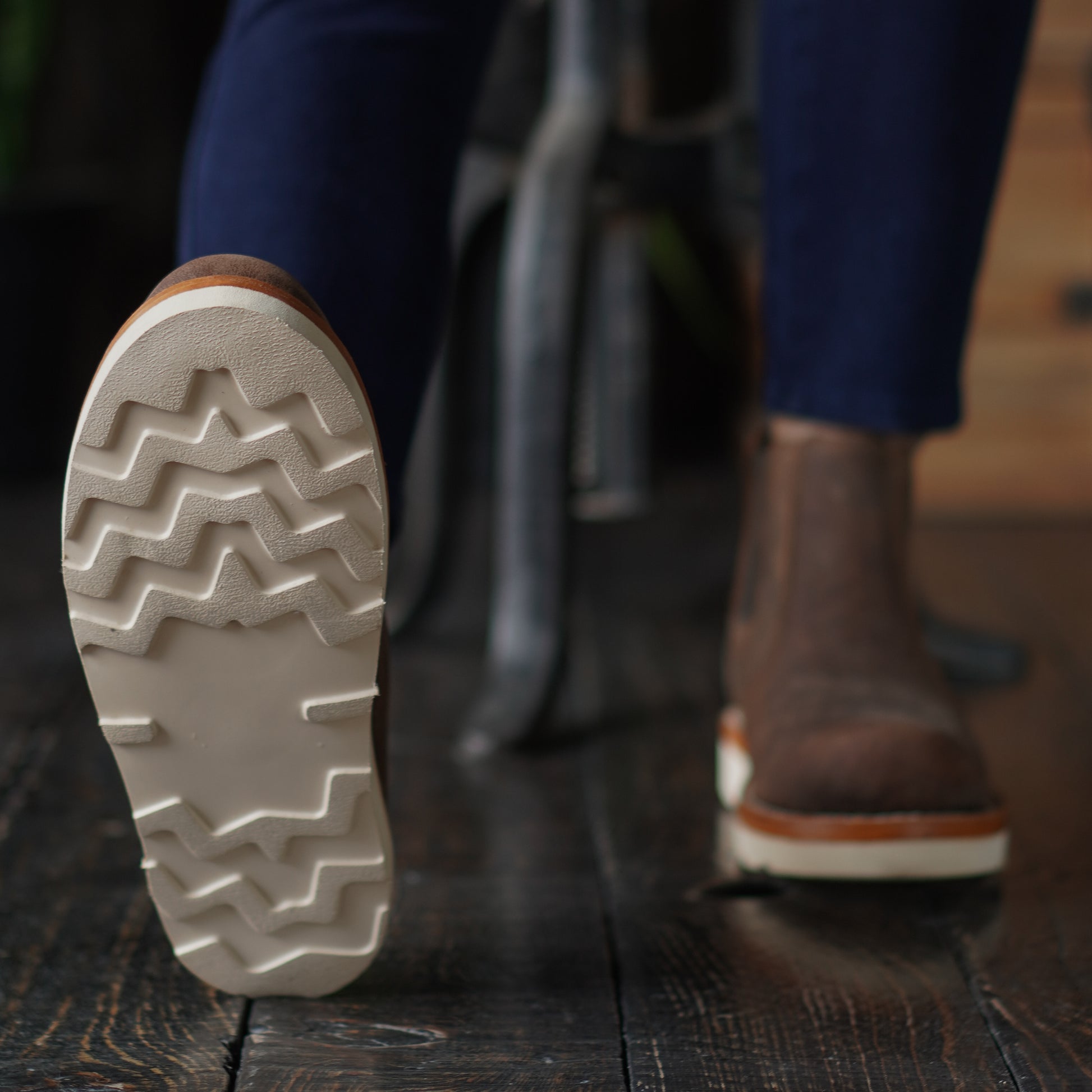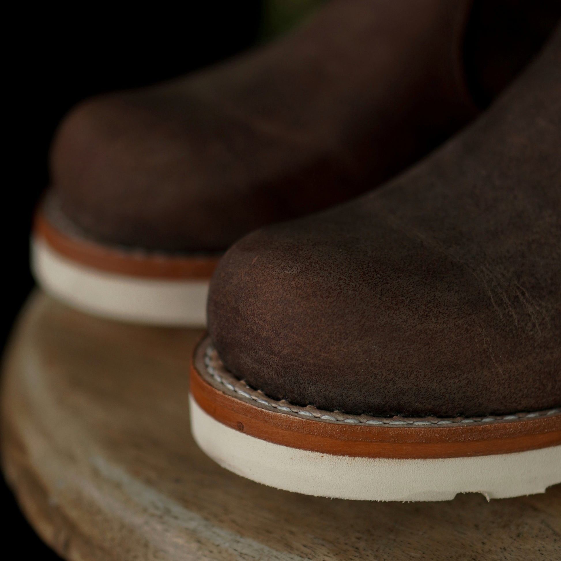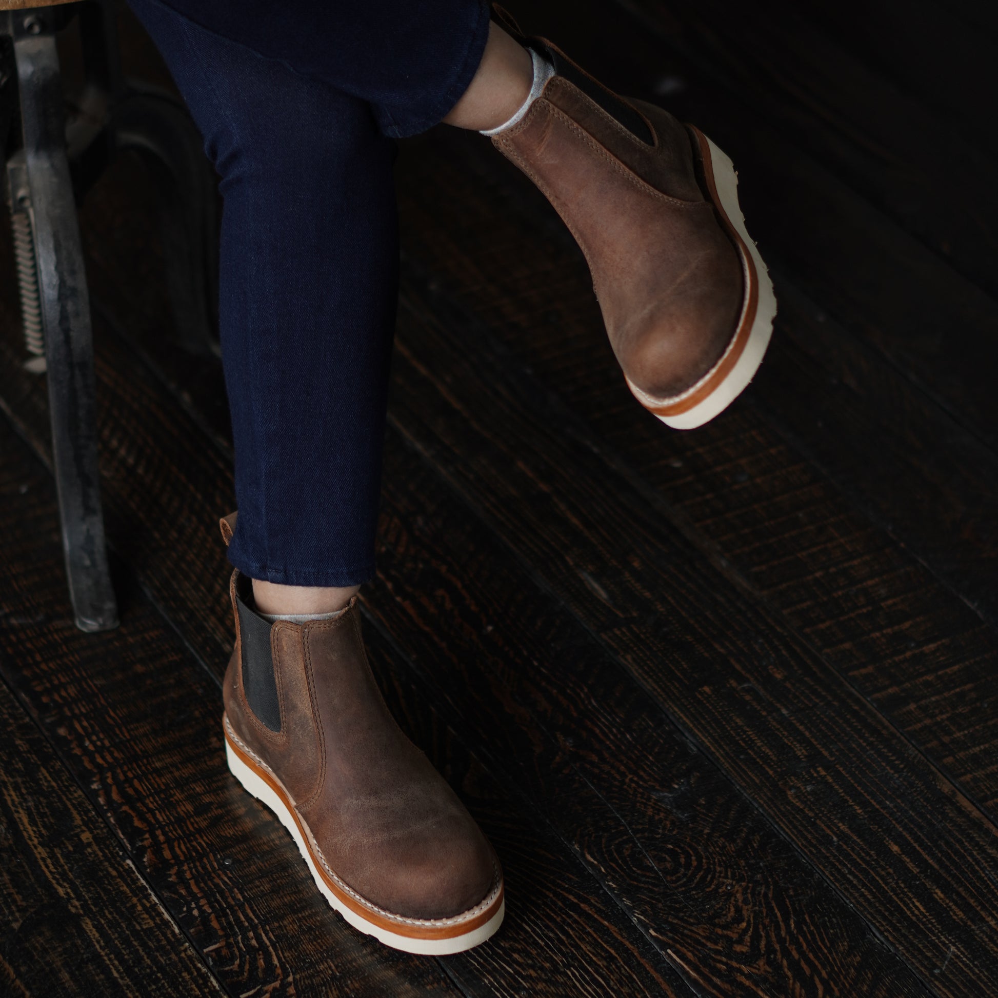These Heritage Style Goodyear welted Chelsea Work Boots with Classic yet rugged upper with panel stitching, flat Goodyear Welt, and Wedge rubberized EVA sole, the perfect boot for rugged-loving women.