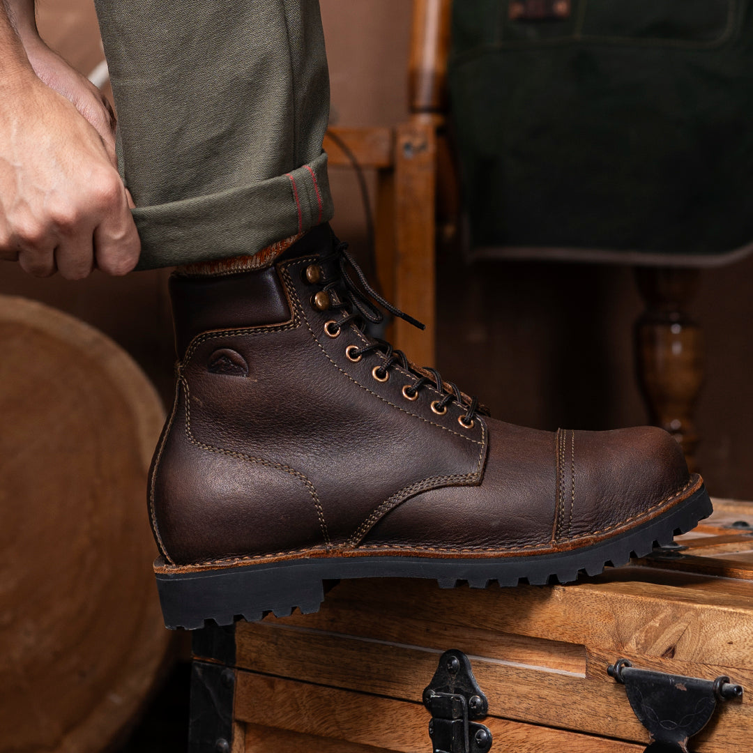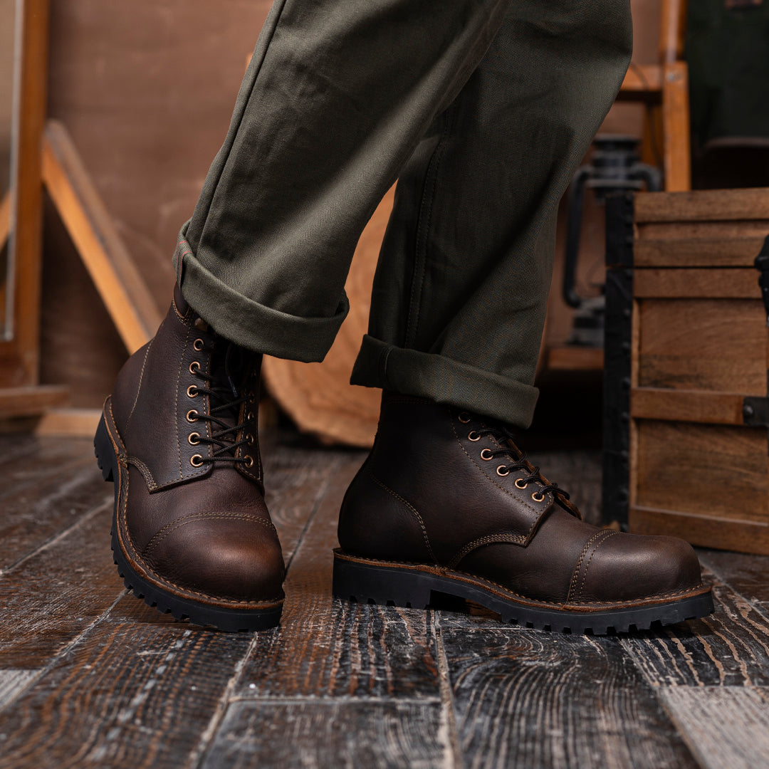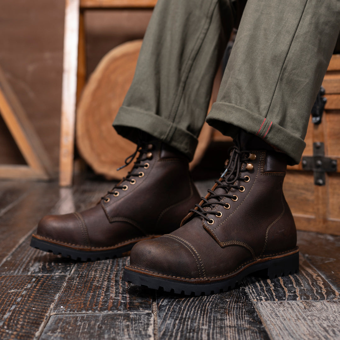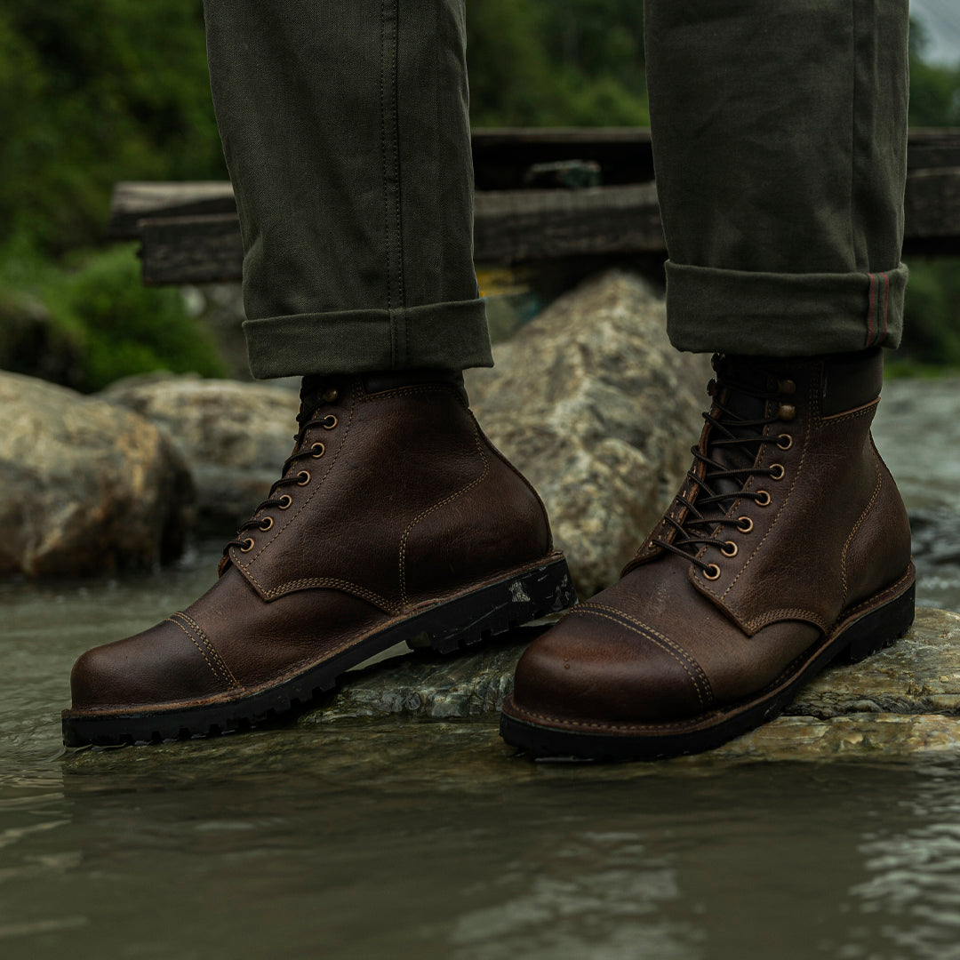 The Vintage Brown Trailmaster is your classic cap-toe silhouette, reimagined for wild terrain. Made entirely from the grain side of our Stormshield44 full-grain buffalo leather, this boot is strong, steady, and stylish in the most rugged way.
