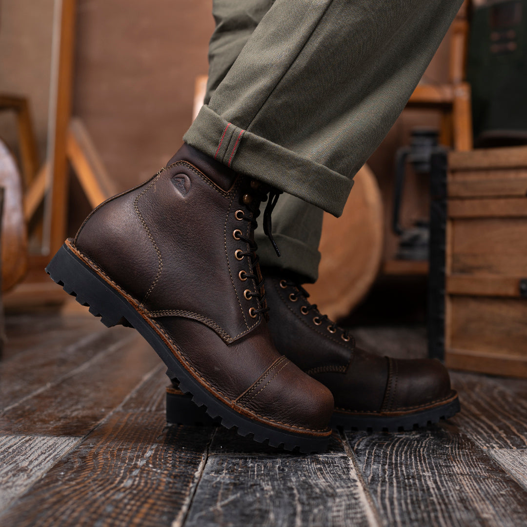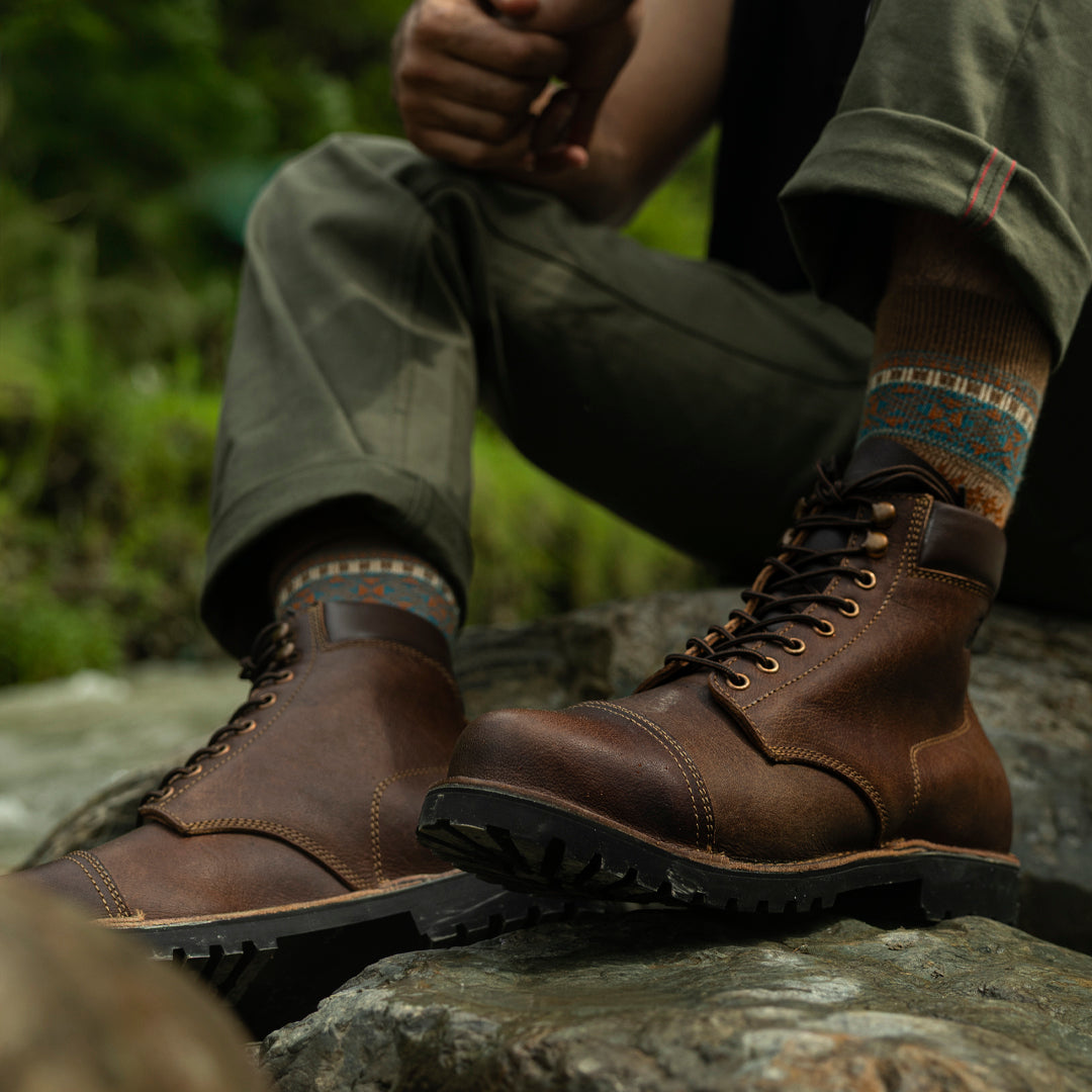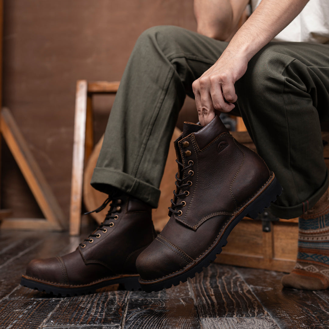 The Vintage Brown Trailmaster is your classic cap-toe silhouette, reimagined for wild terrain. Made entirely from the grain side of our Stormshield44 full-grain buffalo leather, this boot is strong, steady, and stylish in the most rugged way.