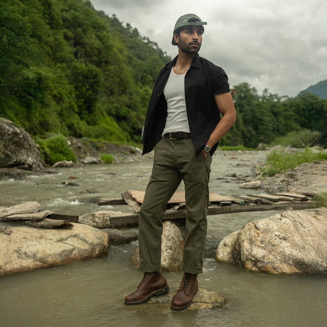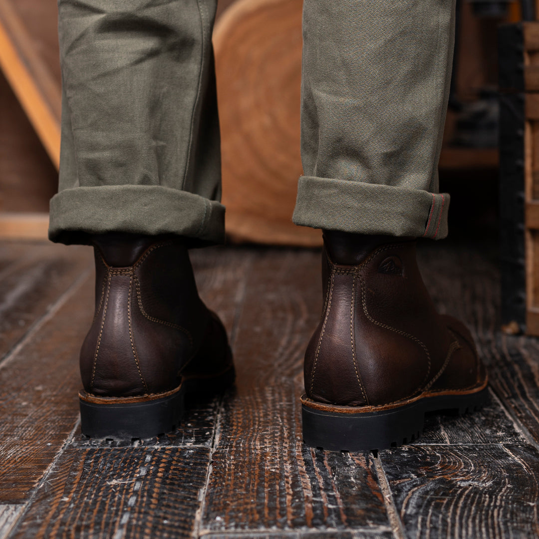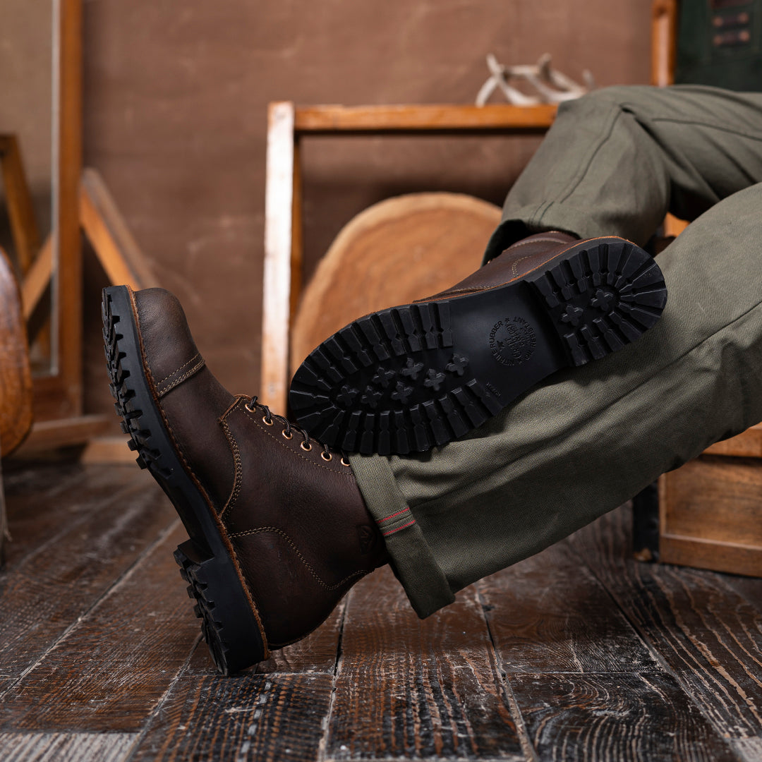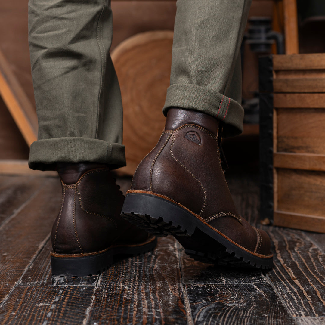 The Vintage Brown Trailmaster is your classic cap-toe silhouette, reimagined for wild terrain. Made entirely from the grain side of our Stormshield44 full-grain buffalo leather, this boot is strong, steady, and stylish in the most rugged way.