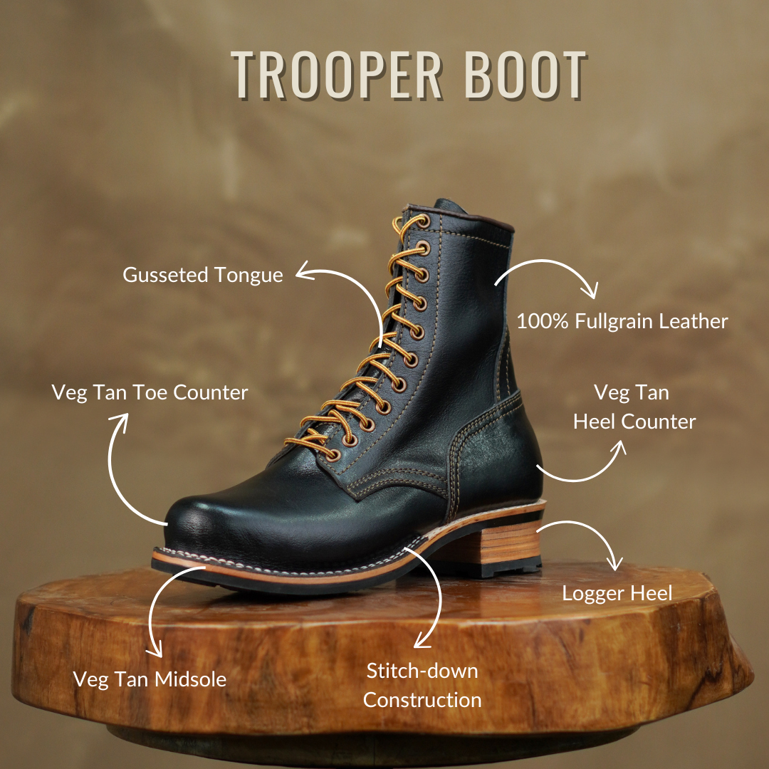 Made using stitch-down construction, the Trooper boot ensures exceptional durability and comfort. Made from 100% full-grain buffalo leather, the Trooper features a sturdy 8-inch shaft, offering unmatched support and protection.