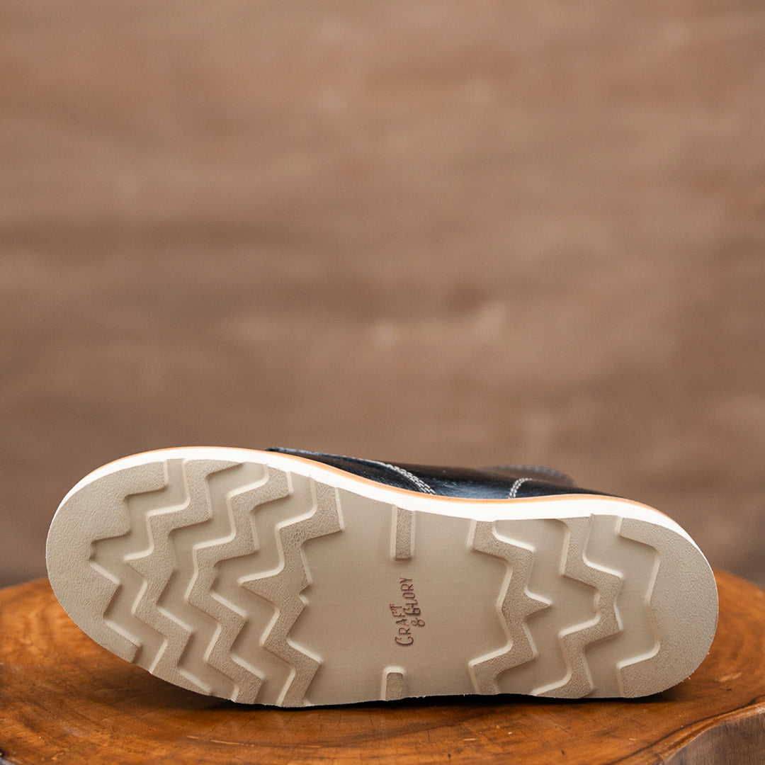 Highest quality natural rubber sole with deep lugs for ultimate traction and abrasion. Stacked leather heels. Sole is handstiched to the welt. Great for outdoors and all day wearing.