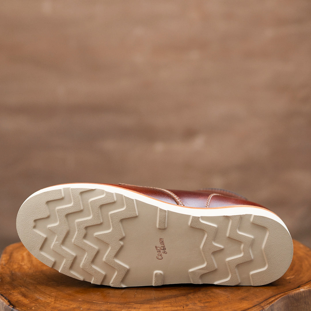 Highest quality natural rubber sole with deep lugs for ultimate traction and abrasion. Stacked leather heels. Sole is handstiched to the welt. Great for outdoors and all day wearing.