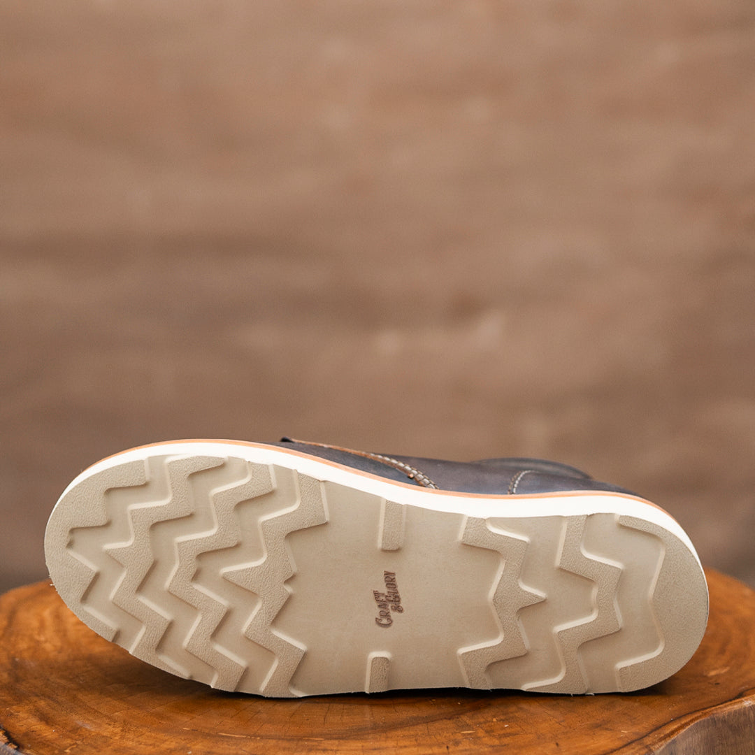 Highest quality natural rubber sole with deep lugs for ultimate traction and abrasion. Stacked leather heels. Sole is handstiched to the welt. Great for outdoors and all day wearing.