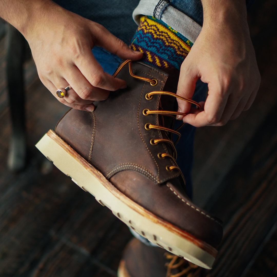 Toe box and heel counters are crafted out of thick vegetable tanned leather and dipped in industrial hardeners to keep your boot structured and durable for a lifetime.