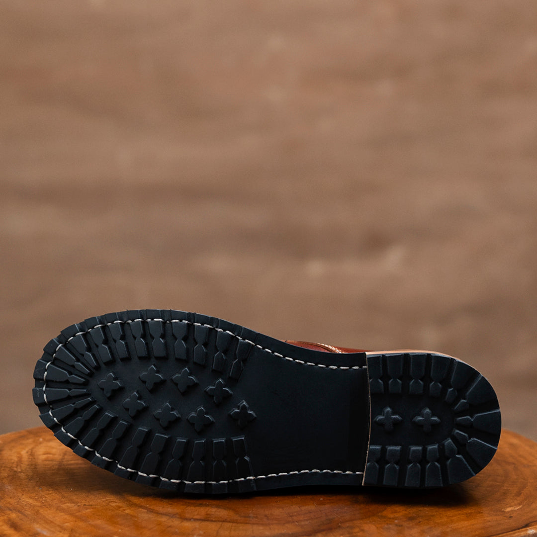 Highest quality natural rubber sole with deep lugs for ultimate traction and abrasion. Stacked leather heels. Sole is handstiched to the welt. Great for outdoors and all day wearing.