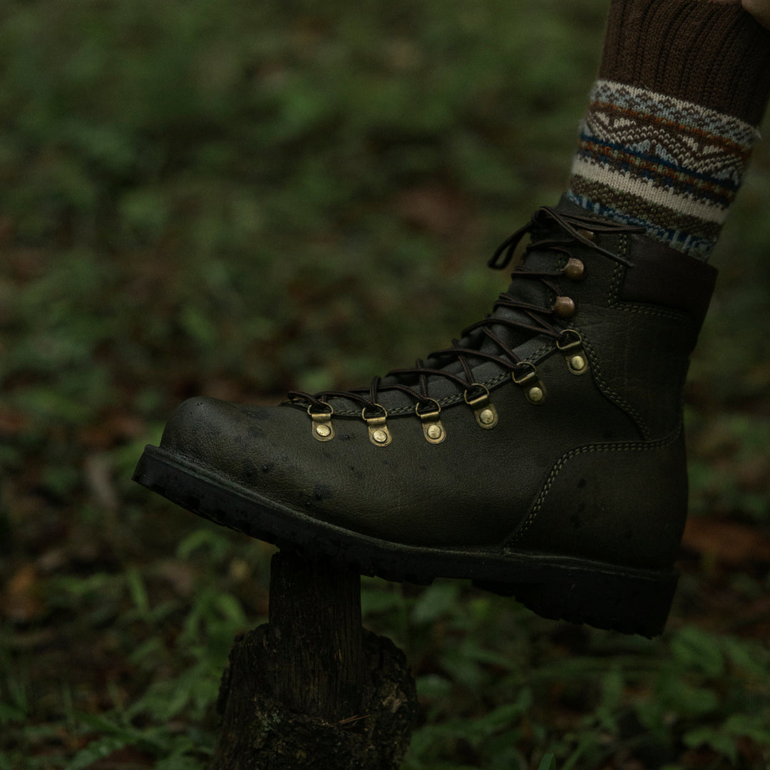 The Moss Green Himalayan Hiker is for those who chase ridgelines, not roads. Made from our proprietary Stormshield44 full-grain buffalo leather, this 2.2 mm oiled leather is not only weather-tough but entirely grain-finished for a clean, powerful look. It's designed to stand up to rough terrain while breaking in with surprising ease.