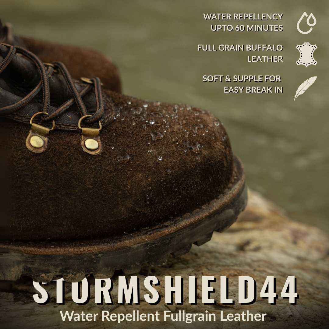 - Upper: 2.2 mm thick full-grain buffalo leather (Stormshield44), used on both grain & rough-out sides