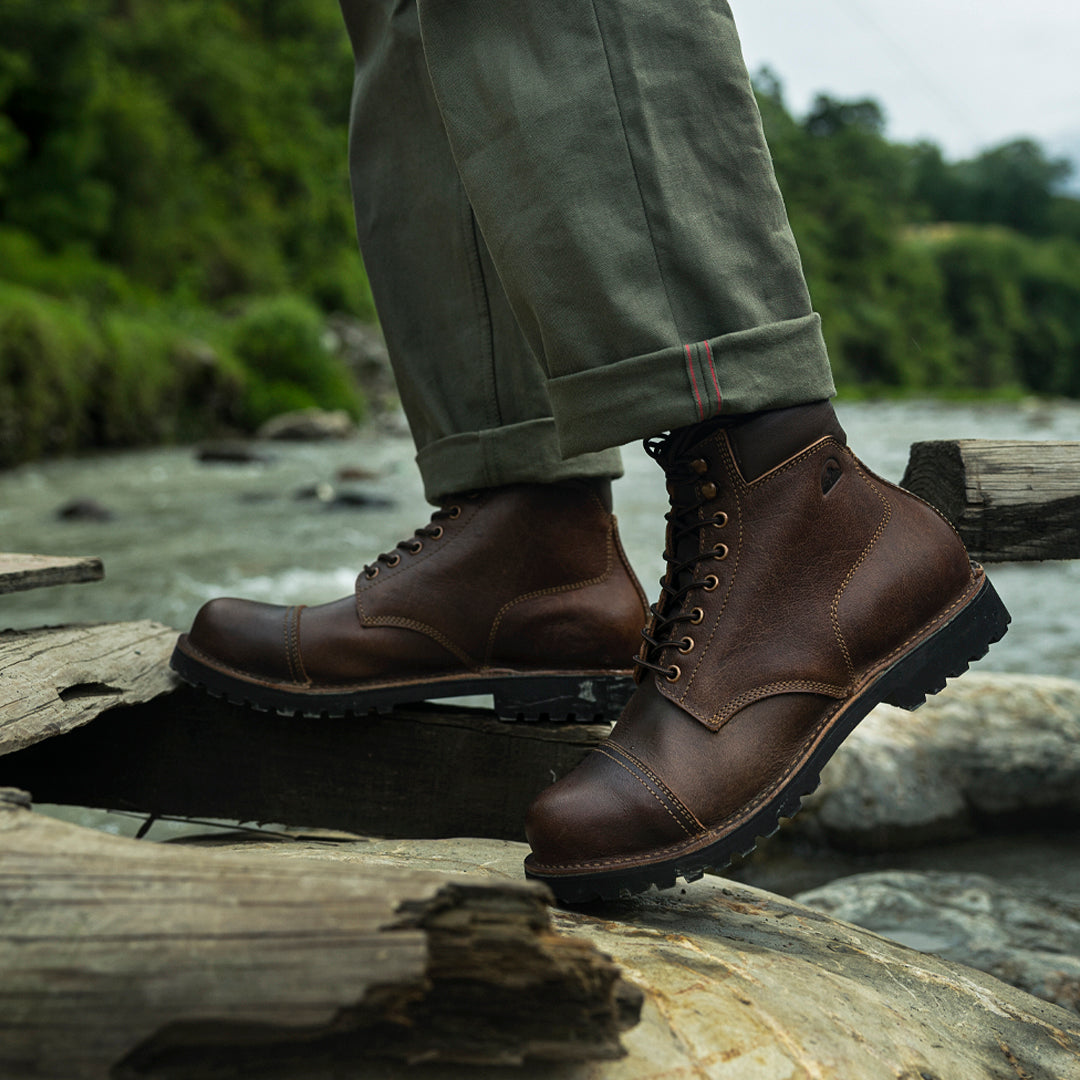 The Vintage Brown Trailmaster is your classic cap-toe silhouette, reimagined for wild terrain. Made entirely from the grain side of our Stormshield44 full-grain buffalo leather, this boot is strong, steady, and stylish in the most rugged way.